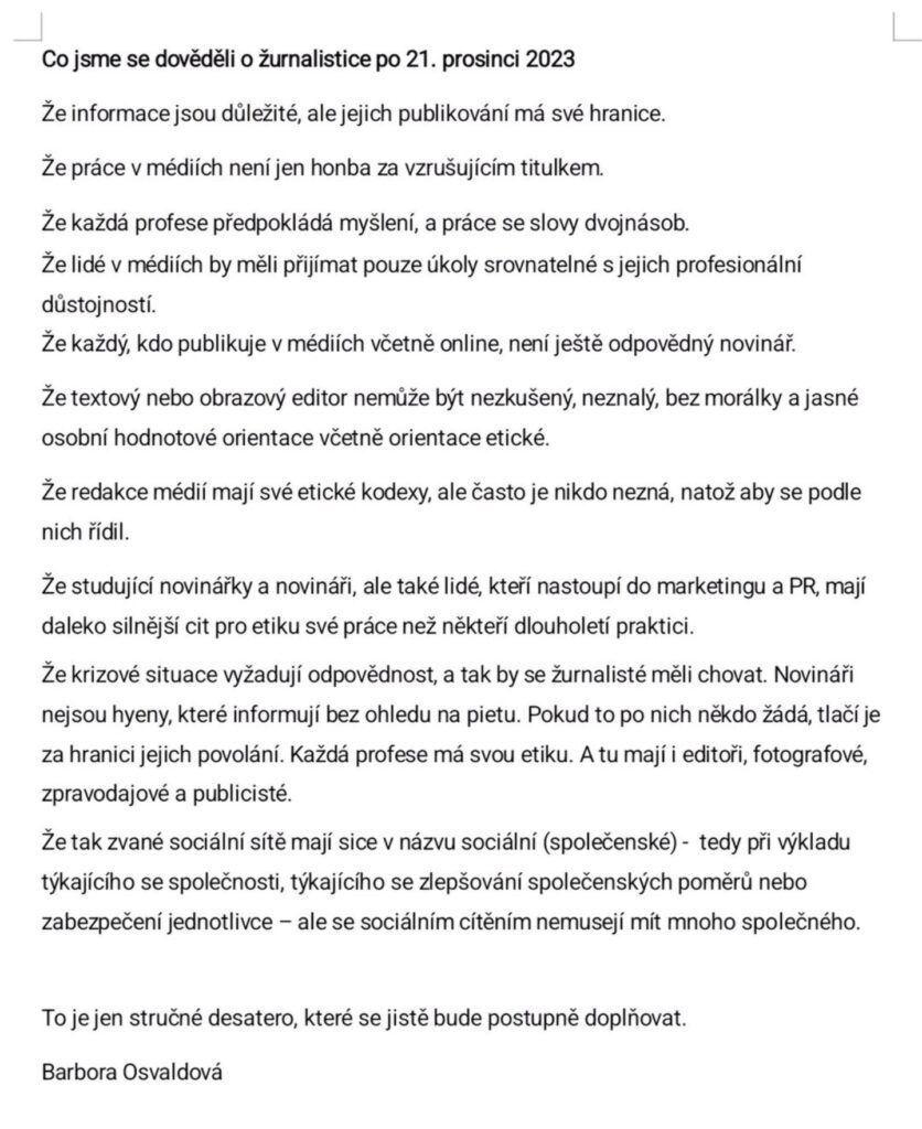 Skvělou reakci na celkovou činnost většiny médií si připravili studenti pražské žurnalistiky. Odkaz na jejich otevřený dopis najdete zde. Obdobně kriticky se vyjádřil i Syndikát novinářů ČR. Barbora Osvaldová, předsedkyně Komise pro etiku při SN ČR a naše učitelka na FSV, svým desaterem řekla vše.