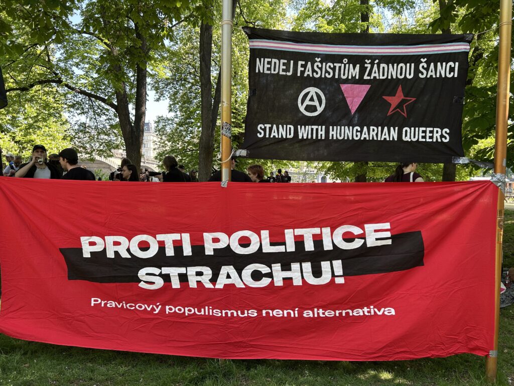 Mé kroky poté směřovaly ke shromáždění anarchistů. Těch se zde sešlo až překvapivé množství, což také potvrdila Anarchistická federace ve svém příběhu na sociální síti Instagram. Mezi anarchisty bylo mnoho osob „vyzdobeno“ různými módními doplňky, které v některých případech připomínaly kostýmy postav z postapokalyptických filmů. Velká část účastníků anarchistické akce s sebou měla nějaký transparent nebo vlajku. Mezi transparenty byly nejvýraznější ty s hesly „NEDEJ FAŠISTŮM ŽÁDNOU ŠANCI, STAND WITH HUNGARIAN QUEERS“ nebo „PROTI POLITICE STRACHU! Pravicový populismus není alternativa“. Další výrazné symboly celého anarchistického shromáždění tvořily palestinské vlajky.