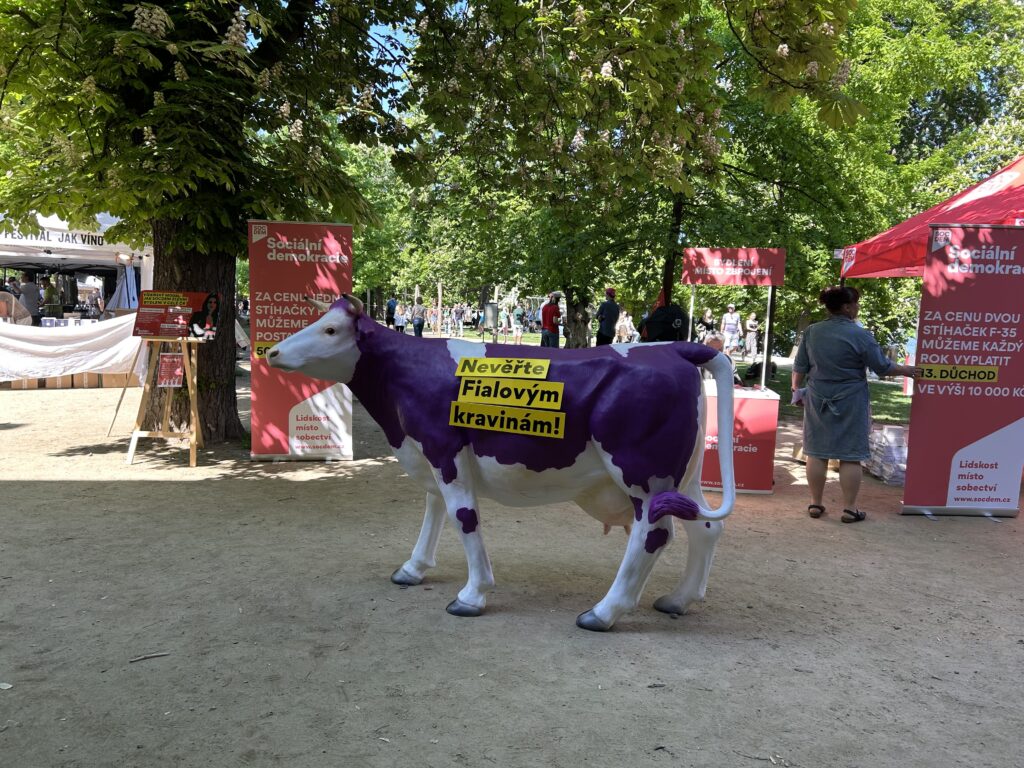 Po nepříliš povedené debatě s anarchistou jsem se vydal ke stánku Mladých sociálních demokratů. Hned na první pohled mě zaujala fialová kráva s nápisem „Nevěřte Fialovým kravinám!“ Tu, jak jsem se dozvěděl, si nechala Sociální demokracie vyrobit na zakázku. Co přesně kráva představuje, uvedl pár hodin před mou návštěvou první místopředseda SOCDEM Lubomír Zaorálek: „Tahle kráva fialová je samozřejmě fejk. Falešná kráva znamená, že z ní žádné mléko nedostanete. Kdyby vám to ta kráva i slibovala, tak z ní nic prostě nevykápne. Je tady proto, že mně připomíná Fialovu vládu.“ Později jsem se od Mladých sociálních demokratů dozvěděl, že se jednalo o premiéru, zřejmě nového symbolu Sociální demokracie. Fialová kráva však také vyvolává kritiku na sociálních sítích. Bývá označována, jako laciný populistický symbol. Kritiky hodná může být však určitá prostoduchost takových hesel, které, kromě slovní hříčky s premiérovým jménem, vlastně nic neříkají. Nedá se tedy říct, zda-li kráva Sociální demokracii pomohla, anebo spíše uškodila.
