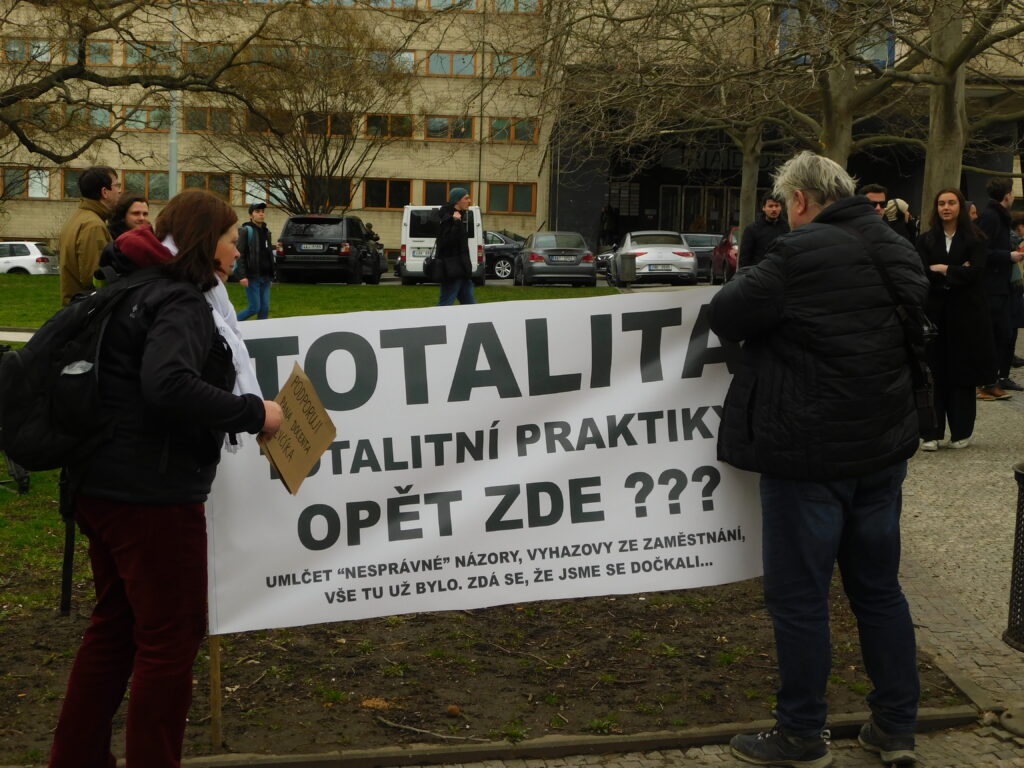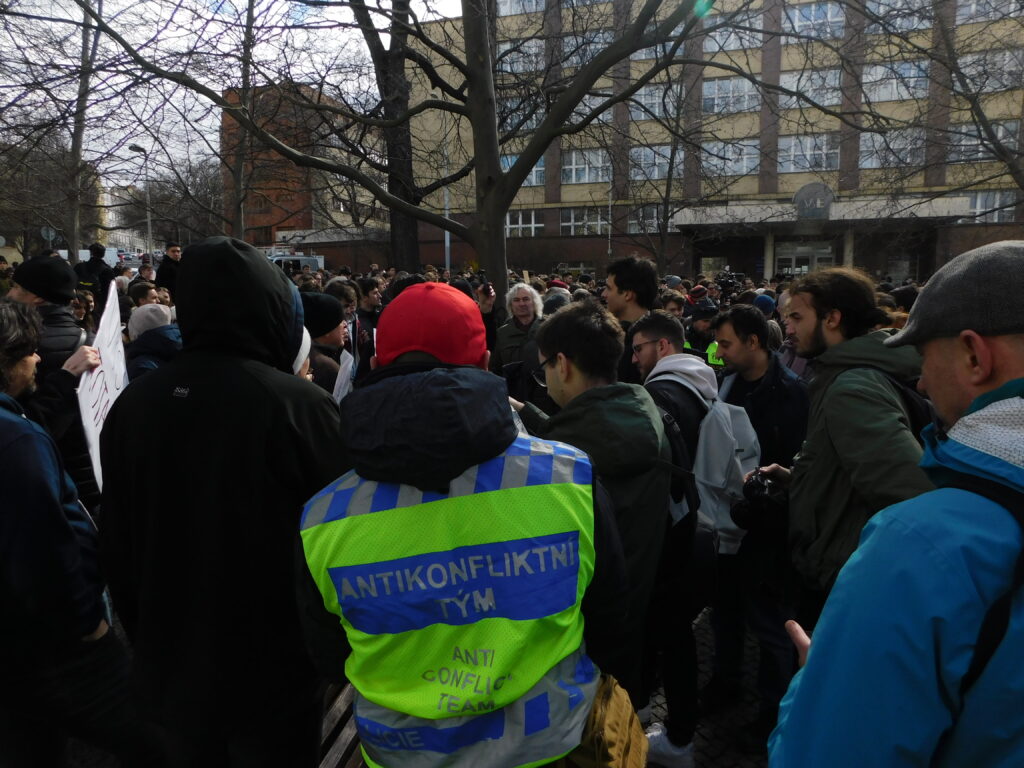 Policisté a antikonfliktní tým jsou v hojném počtu i v prostoru před VŠE. Oddělují od sebe tábory příznivců a odpůrců a jsou připraveni v případě většího konfliktu zakročit. Ke klidu vyzývá předem účastníky demonstrace jeden z organizátorů: „Jsme před naší alma mater, o jejíž dobré jméno usilujeme. Chovejme se tak, a nezapomínejme na to,“ upozorňuje.