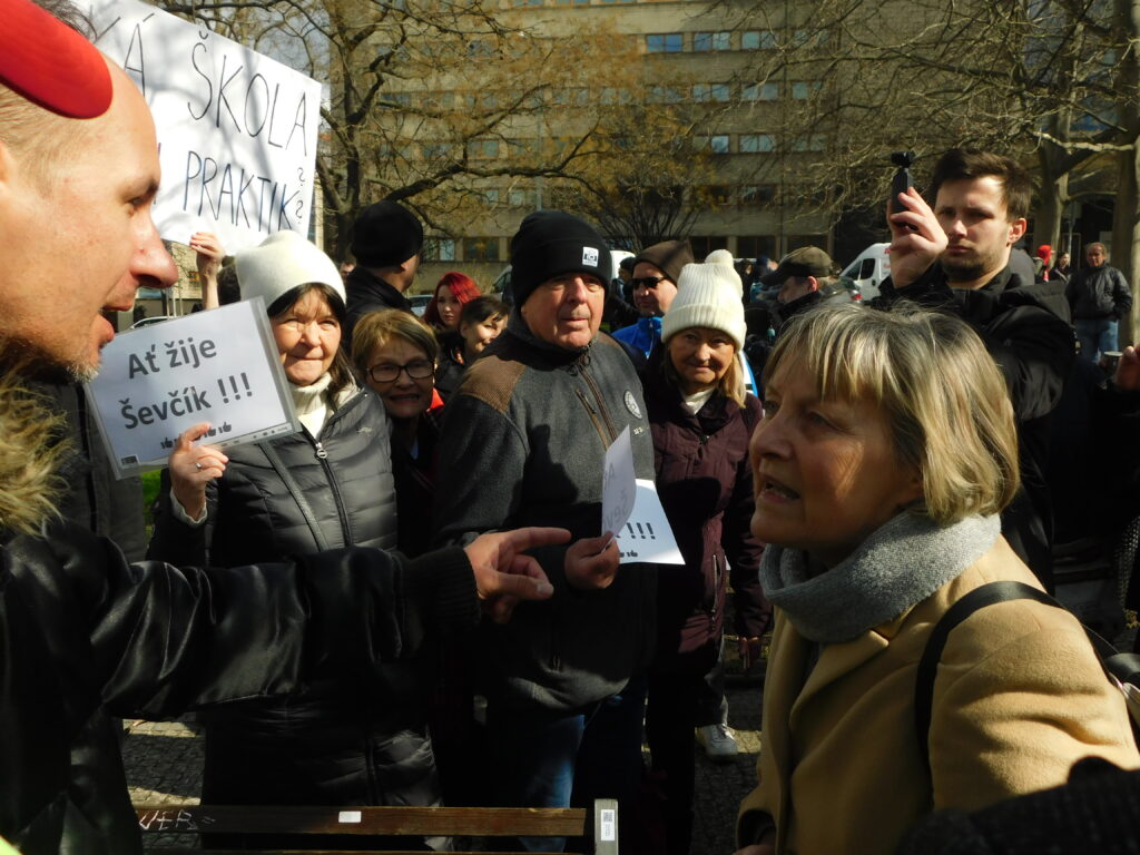 Demonstrovat proti Ševčíkovi přichází studenti na náměstí Winstona Churchilla před budovu VŠE. Ještě před začátkem ve 12:30 se v prostoru začínají scházet nejen odpůrci, ale i zastánci děkana. Mezi prvními tam stojí i Jakub Kuneš, student, který proti děkanovi Národohospodářské fakulty (NF) vystoupil už v době, kdy po čtyřech letech znovu kandidoval do čela fakulty. „Osobně jsem vystupoval už od března loňského roku. Mám ale pocit, že teď už pohár trpělivosti přetekl,“ říká. „Je nutno přiznat, že se pana Ševčíka studenti bojí, a že incident na schodech Národního muzea byl velmi viditelný. Už je to opravdu problém,“ dodává.
